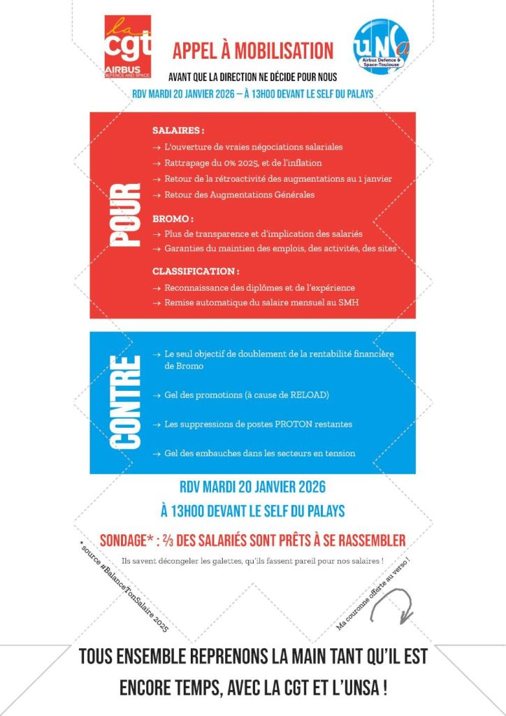 Mobilisation CGT Airbus DS : la CGT organise des mobilisations collectives et unitaires pour construire le rapport de force nécessaire à l’obtention de nouveaux droits, d’avancées sociales et de transformations du travail et de la société en général. Nous affirmons que seule l’action collective peut inverser les politiques de régression sociale.